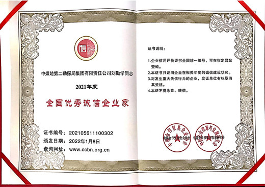 近日,中国合作贸易企业协会及中国企业改革与发展研究会联合发布了优秀诚信企业及企业家评选结果,二勘局集团公司荣获“2021年度中国诚信品牌”、“2021年度全国诚信经营示范单位” 称号,党委书记、董事长、总经理刘勤学同志荣获“2021年度全国优秀诚信企业家”称号。这既是对集团公司诚信体系建设的充分肯定,更是对集团公司逆势而上、高质量发展能力持续提升的认可。